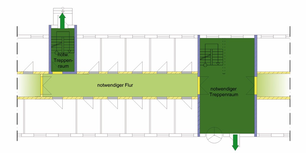 Notwendige Flure und notwendige Treppenräume bilden somit das zentrale Element des Systems der inneren Rettungswege und sind zudem Bestandteil des Systems der inneren Abschottungen.