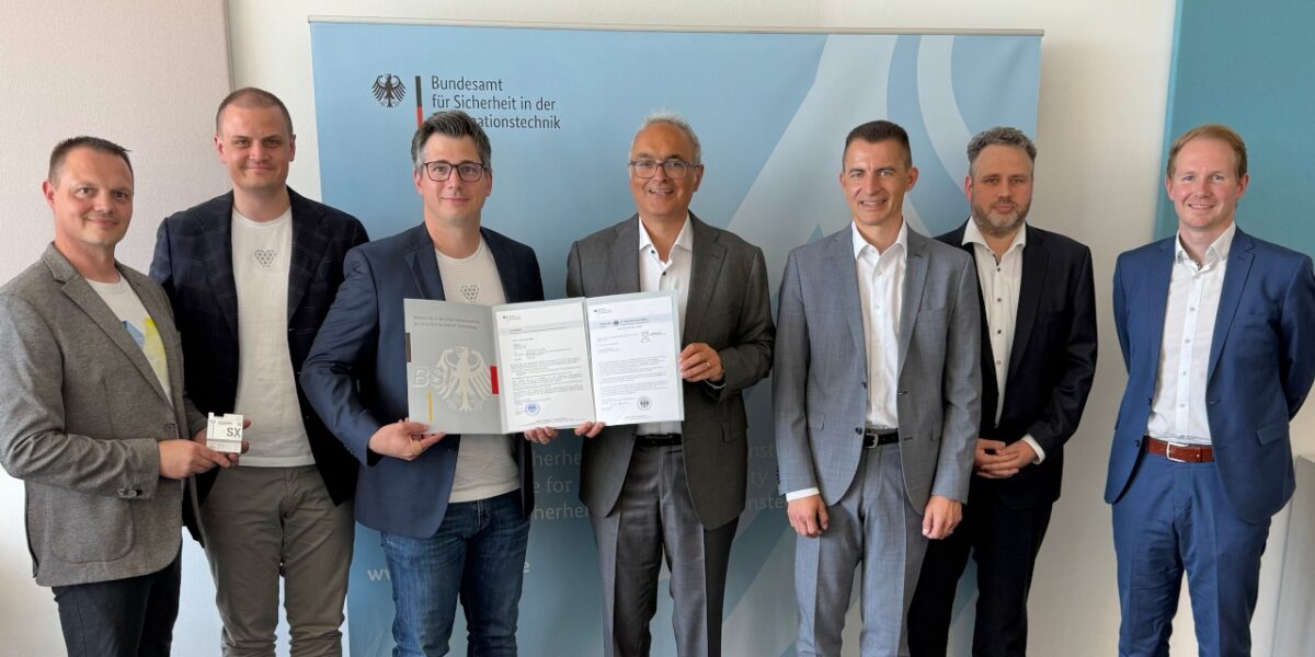 Smarte Steuerboxen zertifiziert (v.l.n.r.): Michael Schmitt, Tamino Lasta, Brian Niehöfer (alle Theben Smart Energy), Sandro Amendola, Dennis Laupichler, Kai Redeker, Michael Brehm (alle BSI).