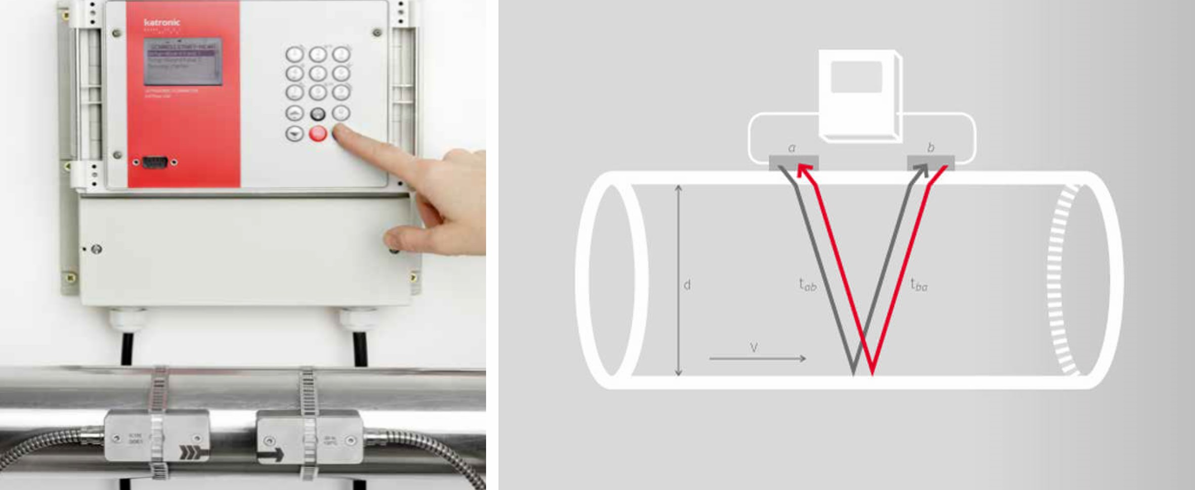 Die Schallwellen breiten sich in Flussrichtung schneller aus als entgegen der Flussrichtung. Aus der Differenz der Laufzeiten lässt sich die Strömungsgeschwindigkeit und damit der Volumenstrom des Mediums bestimmen.