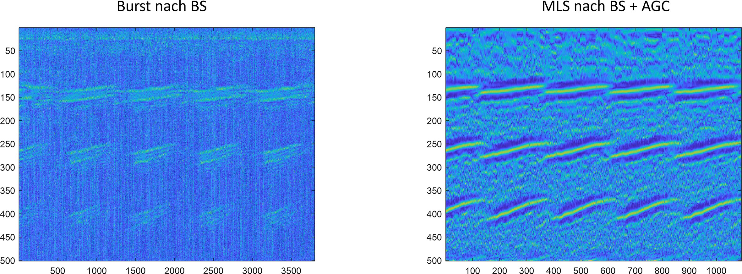 Bild 4.2. Vergleich der Messdaten für circa 5 Umdrehungen der Extruderschnecke bei klassischer Anregung mit Impuls (links) und Anregung mit einer kodierten Maximalfolge (rechts) – Deutlich zu erkennen sind die Änderung des Signal-zu-Rausch-Verhältnis sowie die Mehrfachreflexionen im System. Material: Sabic RELY 5924R bei 160°C. Grafik: ifak