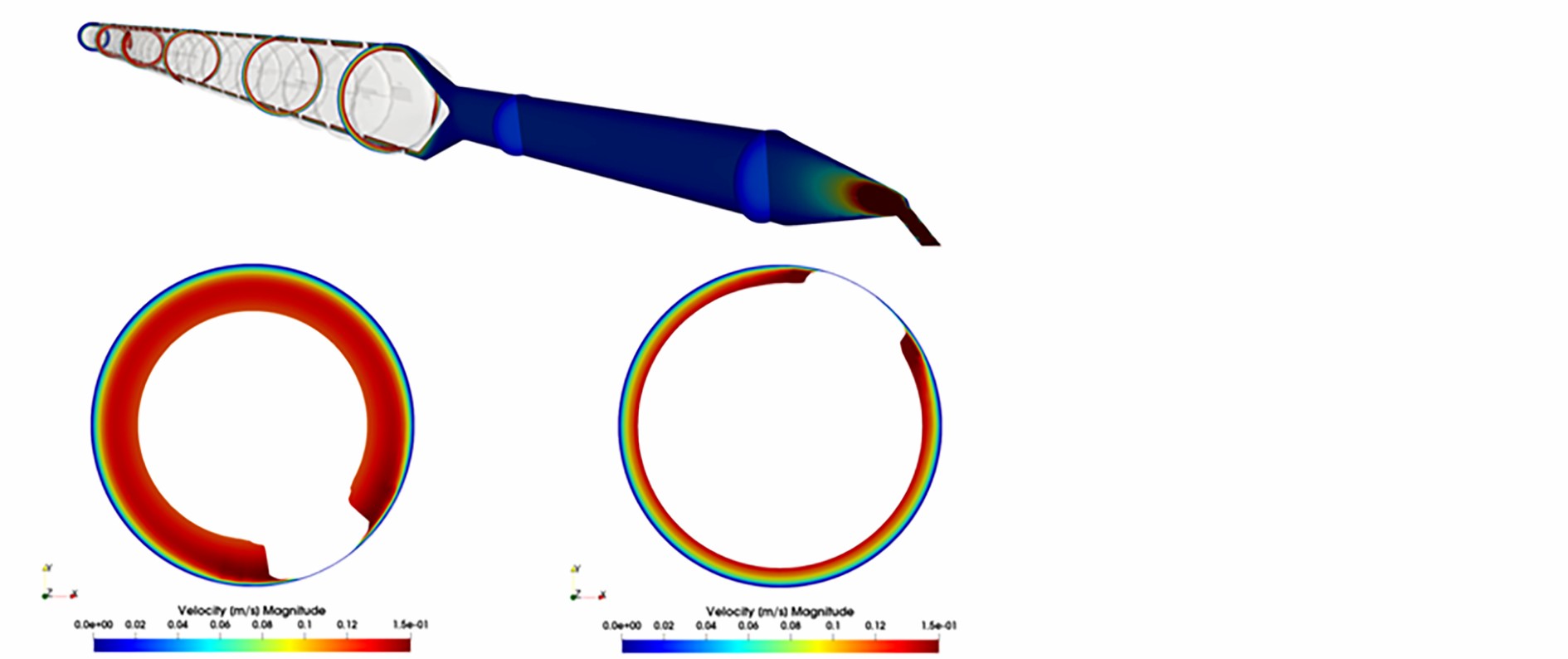 Bild 5. 3D-Simulation der Materialverteilung und Strömung (Geschwindigkeitsverteilung) einer flüssigen Schmelze im Einschneckenextruder. Grafik: ianus