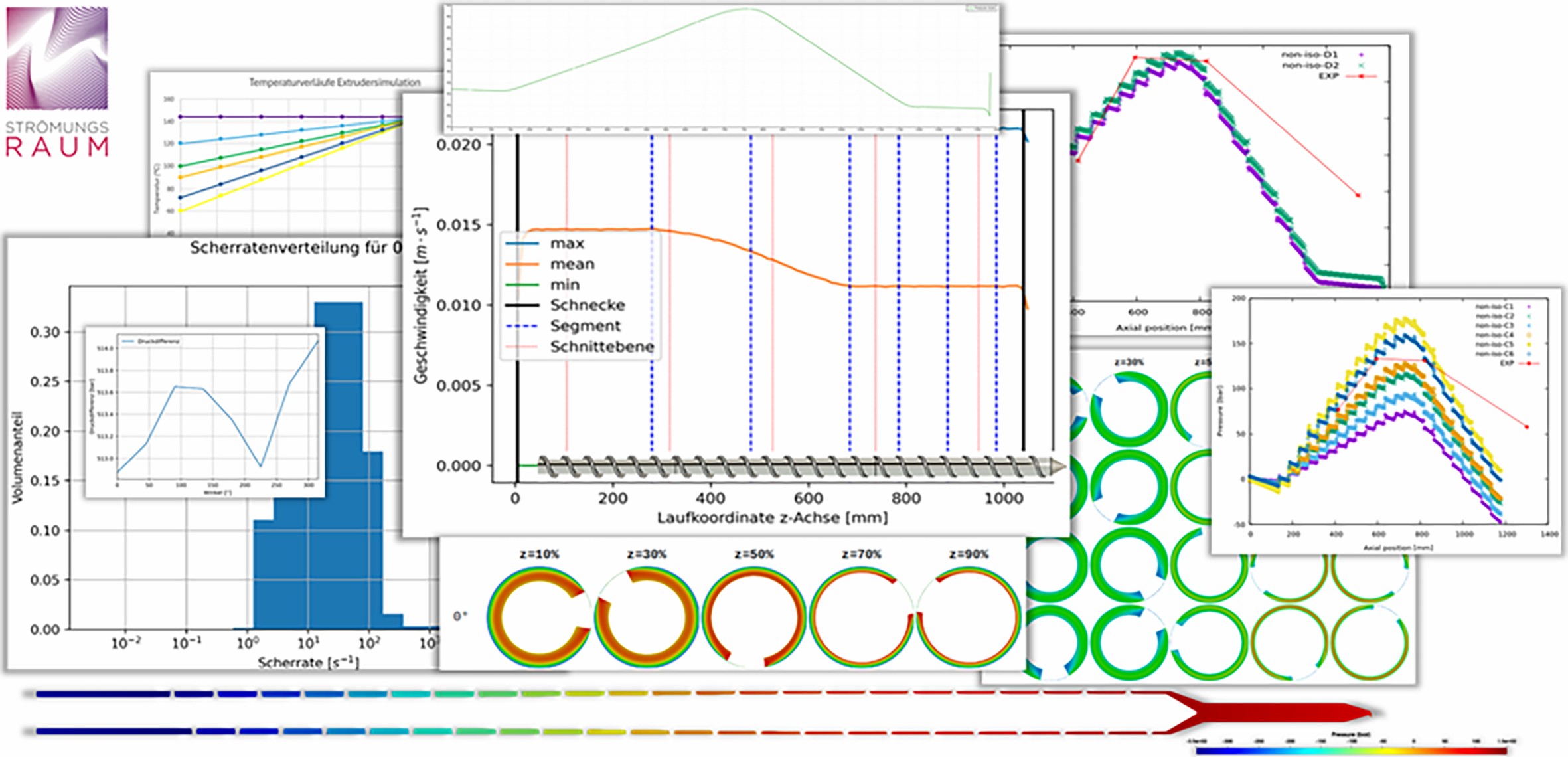 Die Strömungssimulation bildet das zentrale Bindeglied zwischen physikalischem Prozessverständnis und datengetriebener Analyse. Mit der Plattform „StrömungsRaum“ der IANUS Simulation GmbH, Dortmund, steht eine vollständig automatisierte Simulationsumgebung zur Verfügung, die den gesamten CFD-Workflow – von der Geometrieaufbereitung über die Berechnung bis hin zur Ergebnisaufbereitung – abbildet. Für den Extrusionsprozess werden dreidimensionale Modelle erstellt, welche Strömungsgeschwindigkeiten, Temperaturverteilungen, Scher- und Druckfelder sowie Verweilzeitverteilungen der Schmelze berechnen, Bild 5. Diese Simulationen liefern nicht nur ein detailliertes Verständnis der inneren Vorgänge im Extruder, sondern ermöglichen auch die Identifikation kritischer Zonen, etwa mit erhöhten Verweilzeiten oder stagnierendem Materialfluss.