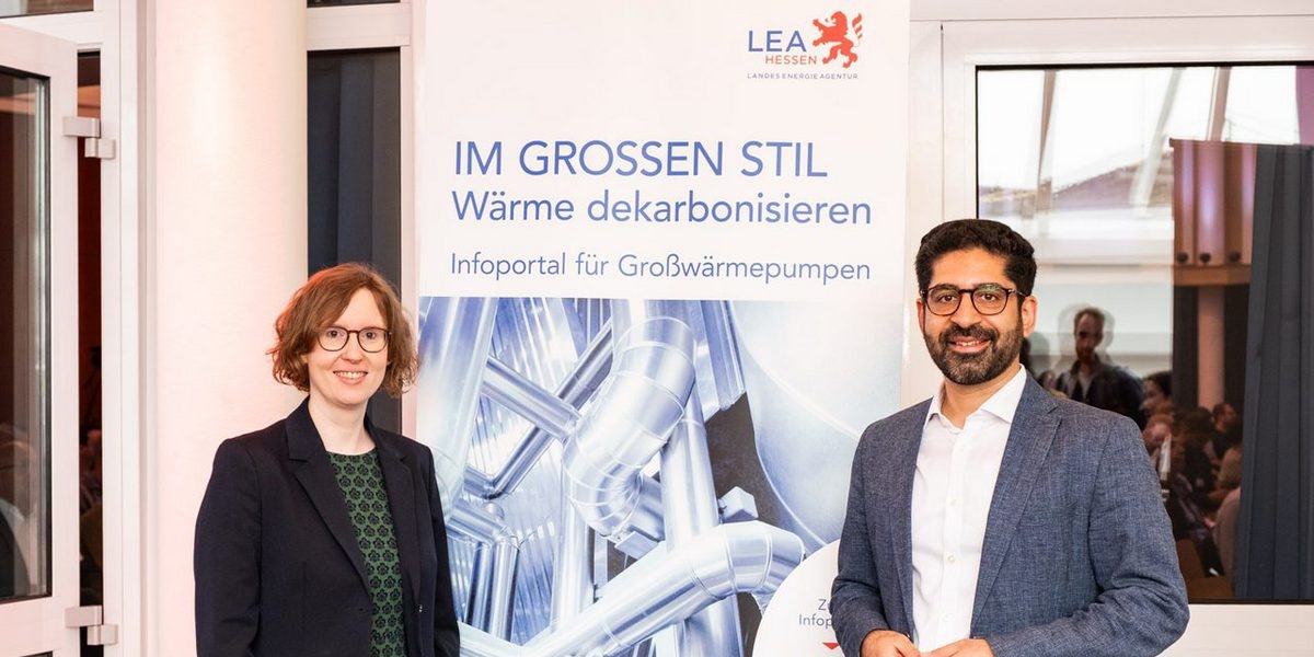 Julia Woth Abteilungsleiterin für Erneuerbare Energien, Wasserstoff & Mobilität bei der LEA Hessen und Hessens Energieminister Kaweh Mansoori präsentieren das neue Portal rund um Großwärmepumpen.