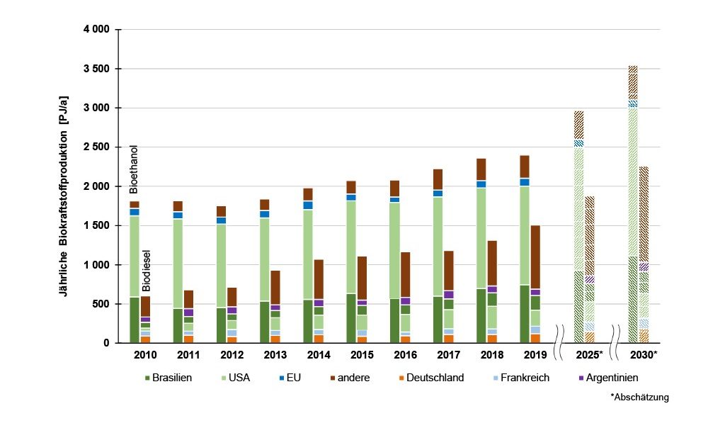 EU. Der EU-Biokraftstoffmarkt ist bis 2020 durch die Richtlinie 2015/1513, die sogenannte ILUC-Richtlinie (indirekte Landnutzungsänderungen), geregelt; dadurch wird der Energieanteil aus Biotreibstoffen auf 10 % des Endenergieverbrauchs im Verkehr bis 2020 begrenzt. Ausgehend davon wurden 2019 in der EU 5,6 Mrd. l/a Bioethanol verbraucht; dies bedeutet einen leicht gestiegenen Verbrauch im Vergleich zu 2018 (5,5 Mrd. l/a) [38]. Hauptproduzenten und Hauptverbraucher sind Deutschland (0,9 Mrd. l/a produziert und 1,9 Mrd. l/a verbraucht) und Frankreich (0,8 / 1,4 Mrd. l/a) [17; 39]. In Frankreich stieg der Verbrauch von Bioethanol von 2017 bis 2019 um etwa 22,6 %. Dies ist ein Effekt der Popularisierung von E85 aufgrund der Homologation von Umrüstsätzen zur Flexibilisierung der Verwendung dieses Kraftstoffs in Pkw mit Ottomotor.