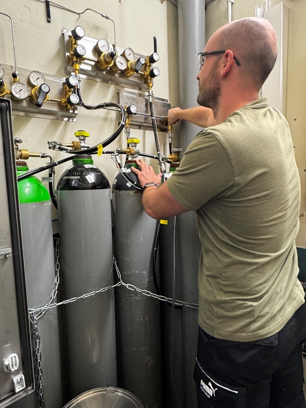 Ein Mitarbeiter von Radical Dot stellt die Gase für das chemische Recyling per katalytischer Oxidation ein.