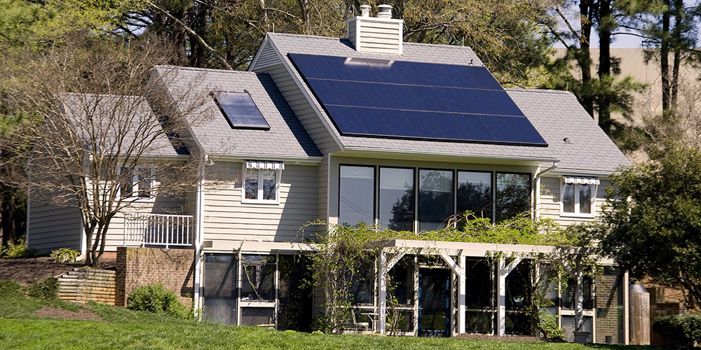 Ein Haus mit einer Solaranlage auf dem Dach.