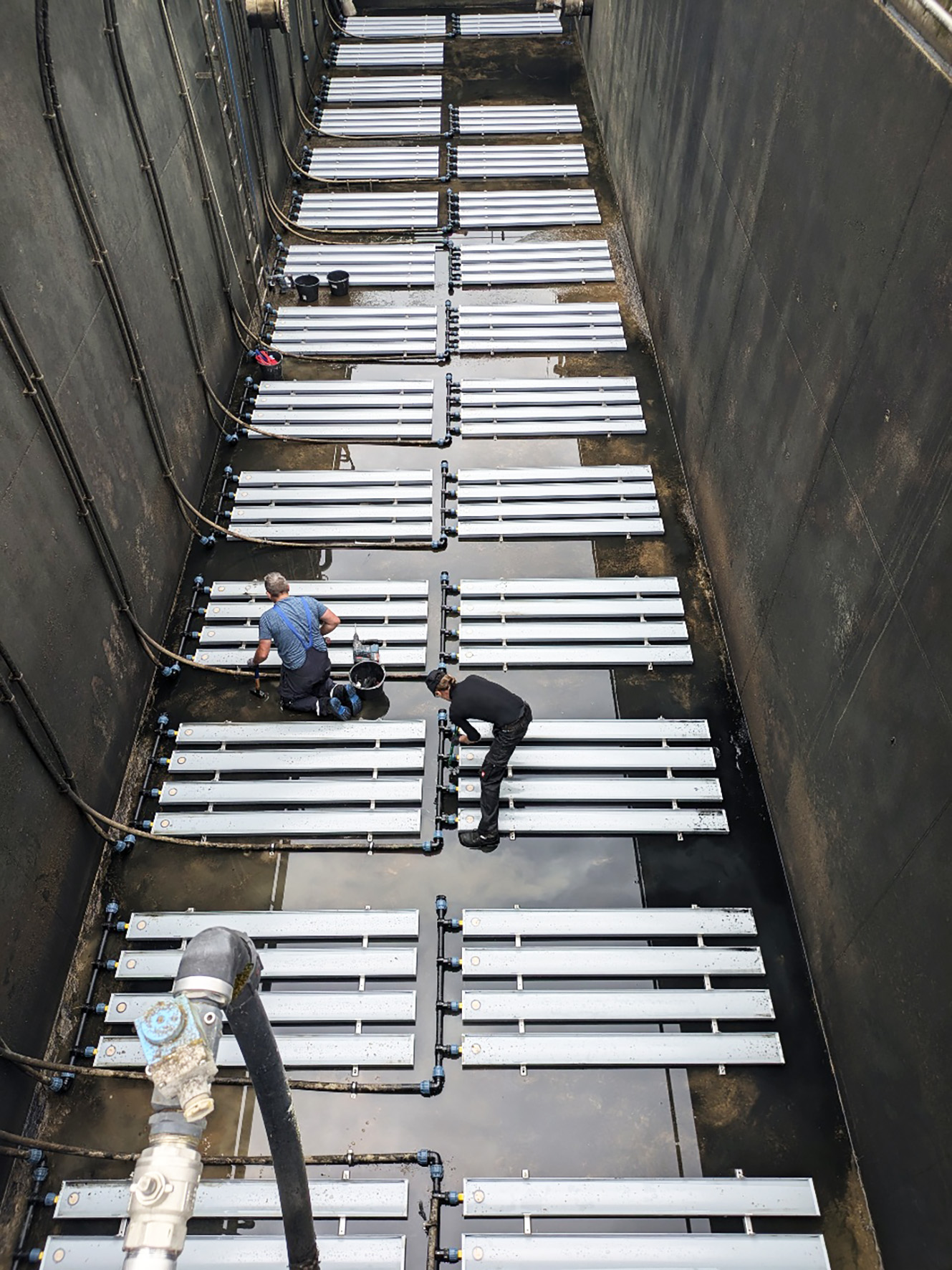 Bald könnte die gesamte Anlage sogar energieautark laufen – dank neuer Streifenbelüfter. Die Belüftung der drei Biologiestraßen der Kläranlage wurde in den Monaten Mai bis Oktober 2024 vollständig auf die deutlich energieeffizienteren Belüftermodule der niederösterreichischen Firma Aquaconsult Anlagenbau aus Traiskirchen südlich von Wien umgerüstet: die „Aeropstrip Type G“-Module. Jedes dieser Module besteht aus vier „Type Q2,0“-Streifenbelüftern.