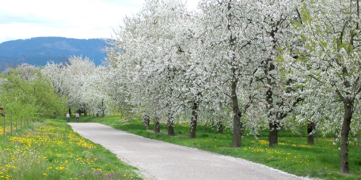 Kirschblüte in der Gemeinde Mösbach im Renchtal, Baden-Württemberg. Sie schafft die Grundlage für die Kirschwässer, die Schnapsbrennereien im Renchtal vor allem im Winter herstellen.