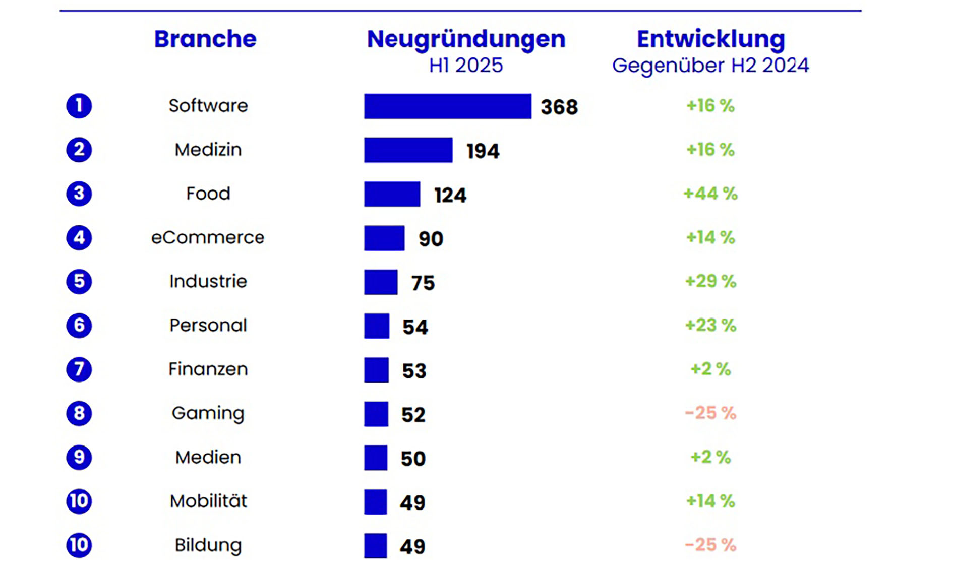 Mit Abstand die meisten Neugründungen (368) entfallen auf den Software-Sektor, der im Vergleich zum Vorhalbjahr um 16 % zulegt. Auch industrielle Lösungen, etwa im Bereich KI-gestützter Automatisierung, gewinnen deutlich an Bedeutung – hier kann ein Wachstum von 29 % verzeichnet werden. Das ist – nach dem Food-Bereich – der stärkste Anstieg unter allen Branchen.