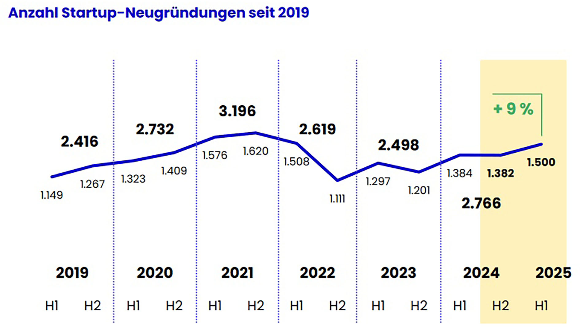 Die Gründungsaktivität in Deutschland nimmt trotz anhaltender wirtschaftlicher Unsicherheiten weiter zu: Im ersten Halbjahr 2025 wurden bundesweit 1 500 Unternehmen neu gegründet – ein Zuwachs von 9 % im Vergleich zum zweiten Halbjahr 2024. Das belegen die neusten Daten aus der Report-Reihe „Next Generation – Start-up-Neugründungen in Deutschland“, die vom Startup-Verband und den Analysten von Startupdetector veröffentlicht wurden.