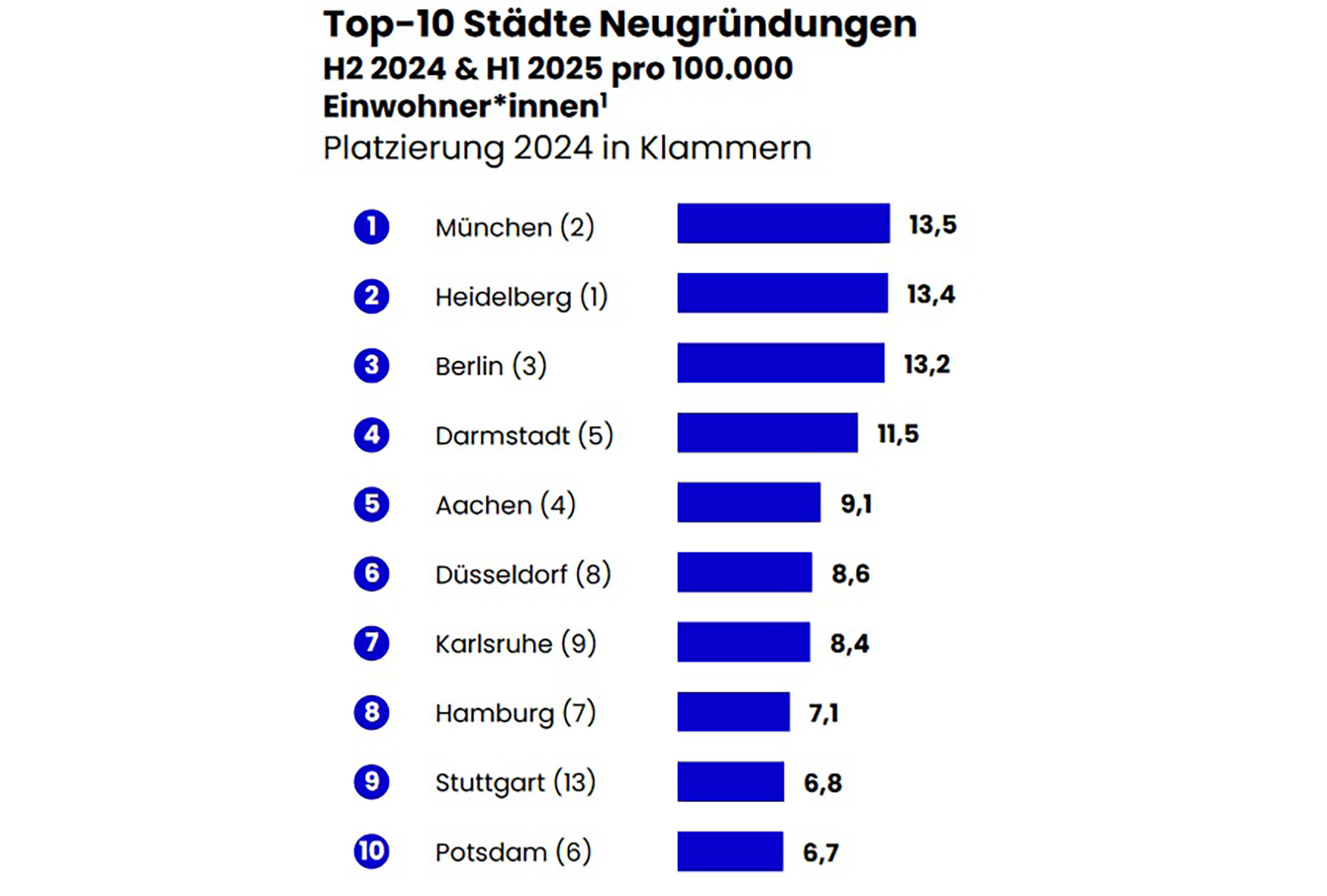 Regional zeigt sich ein differenziertes Bild: Die stärkste Gründungsaktivität pro Kopf entfällt auf die internationalen Hotspots Berlin und München. Aber auch Forschungsstandorte wie Heidelberg, Darmstadt und Aachen tragen maßgeblich zur aktuellen Dynamik bei.