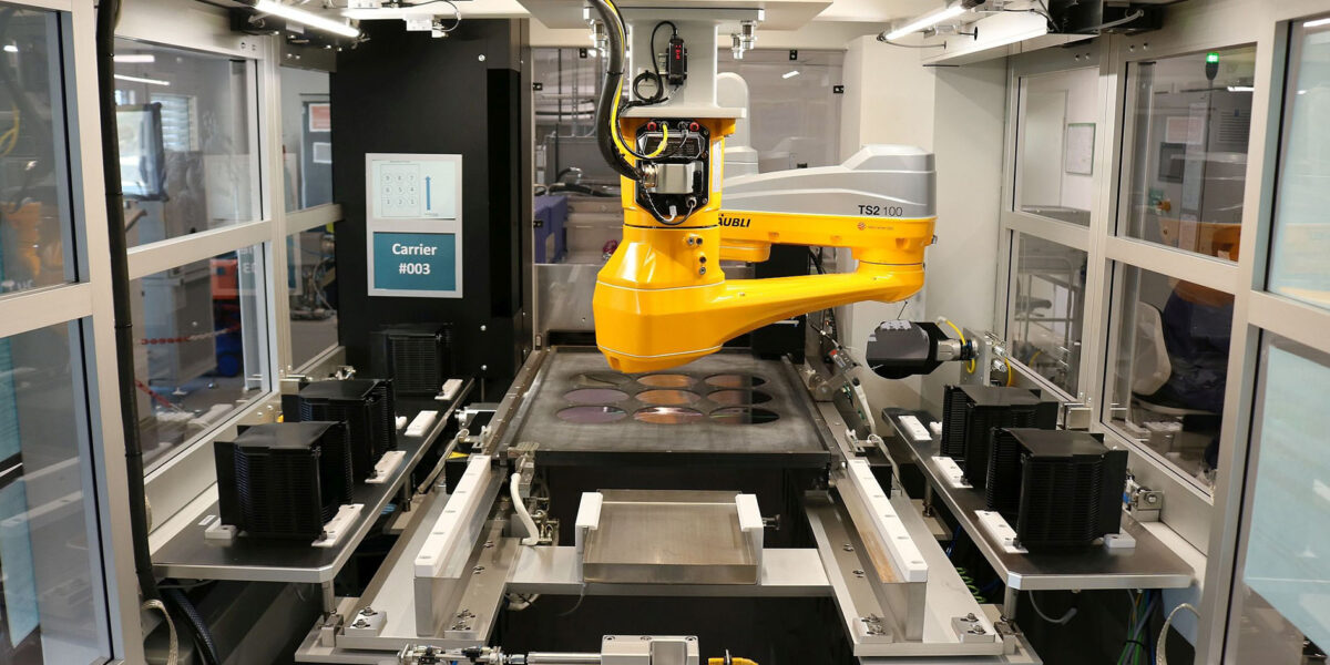 Die Solarzellen werden dafür in Kassetten bereitgestellt, herausgenommen und in nur wenige Hundert Mikrometer größere Taschen spezieller Kohlefaser-Werkstückträger positioniert. Je nach Zellgröße können die 1000 mm x 600 mm großen Carrier vier, neun oder 16 Wafer aufnehmen. Um Crashs zu vermeiden, muss beim Beladen der Werkstückträger eine Positioniergenauigkeit von +/- 0,1 mm stabil eingehalten werden. Nach der ein- oder zweiseitigen Beschichtung sind die Solarzellen wieder in Kassetten abzulegen.