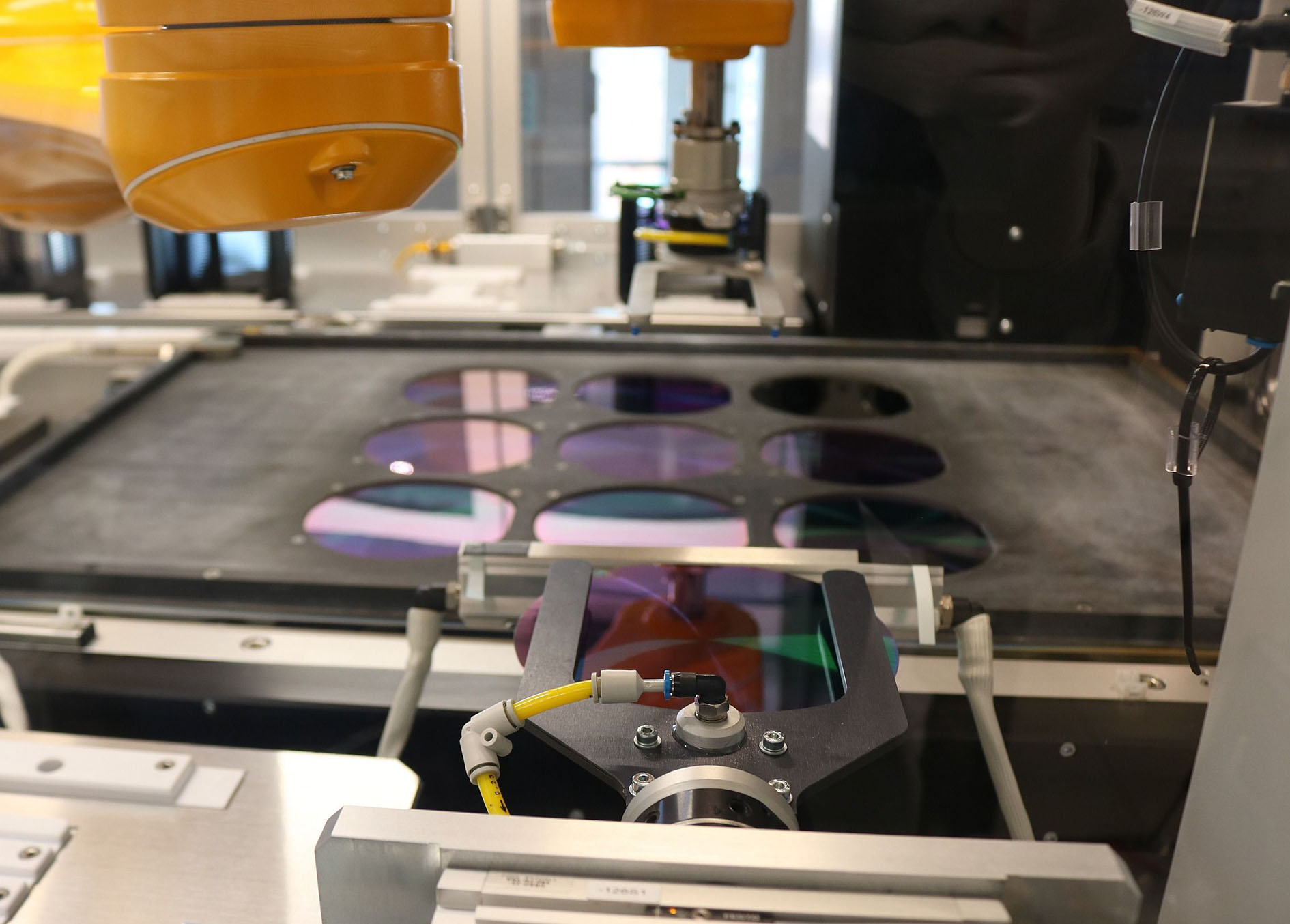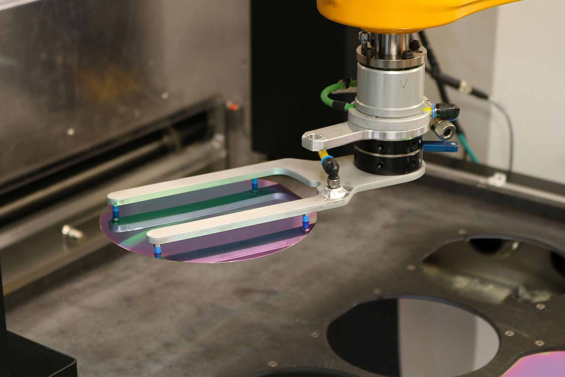Für diese Aufgabenstellung entwickelte der Automatisierungsspezialist acp systems AG eine intelligente, bildverarbeitungsgestützte Handlinglösung mit einem Industrieroboter. Dieser wurde aus Platzgründen an der Decke des Beladebereichs der Beschichtungsanlage montiert und hat eine Reichweite von 1000 mm. Ausgestattet ist der „Scara“ (Selective Compliance Assembly Robot Arm) mit einem speziellen Flach-Vakuumgreifsystem, das für die verschieden großen Wafer schnell austauschbar ist.