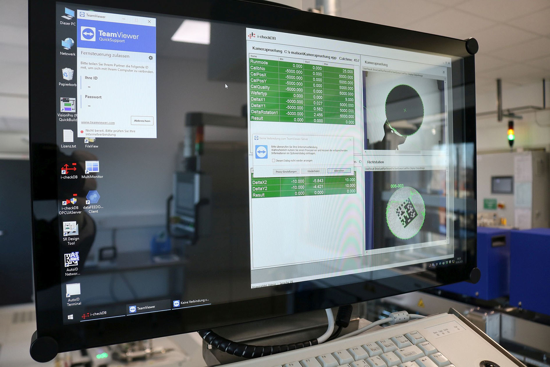 Der Roboter entnimmt den Wafer aus der Kassette und legt ihn auf einem hinterleuchteten Ausrichttisch ab. Darüber ist ein Kamerasystem mit 12-MP-Kamera im Arbeitsabstand von 680 mm platziert. Sie erkennt die genaue Position des Wafers und gibt diese Information an die „Cognex Vision Pro“-Software weiter.