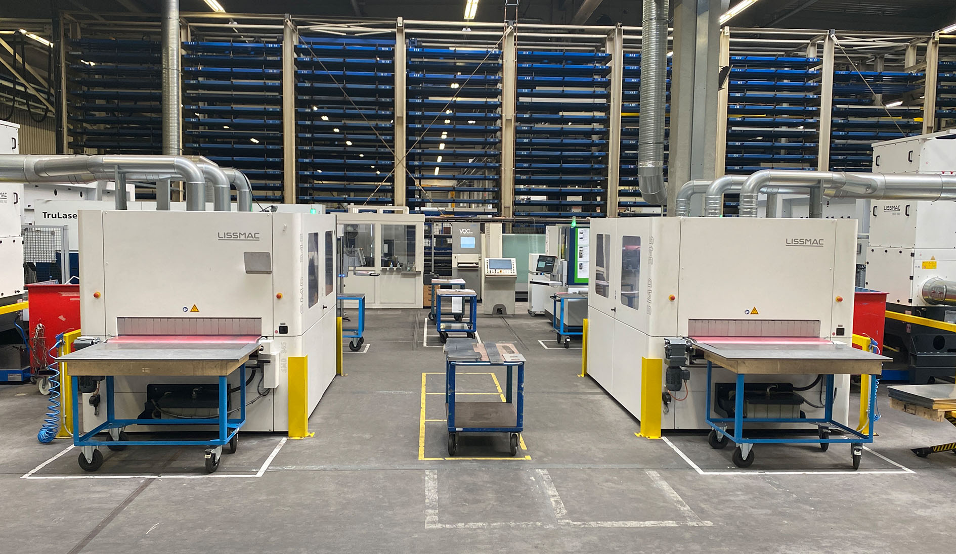 Mit der Anschaffung der SBM L 1500 im Jahr 2019 wurde bereits deutlich, dass das Materialmanagement optimiert werden muss. Als im Jahr 2021 dann zwei vollautomatisierte Trumpf-Fiberlaser-Schneidmaschinen mit angeschlossenem Stopa-Lager angeschafft wurden, stand das Thema wieder im Raum – und sollte nun „zu Ende gedacht“ werden. „Wenn der Mitarbeiter das Teil aus der Laseranlage herausnimmt, sollte er es auch direkt auf der Schleifmaschine ablegen. Der durchgängige Material-Flow war uns wichtig und sollte rasch umgesetzt werden“, sagt Würker. Das Ziel war auch, manuelle Arbeiten und hohe Durchlaufzeiten zu vermeiden. Dementsprechend wurden im Jahr 2022 zwei weitere Anlagen angeschafft, mit denen dieser nahtlose Prozess realisiert werden konnte.