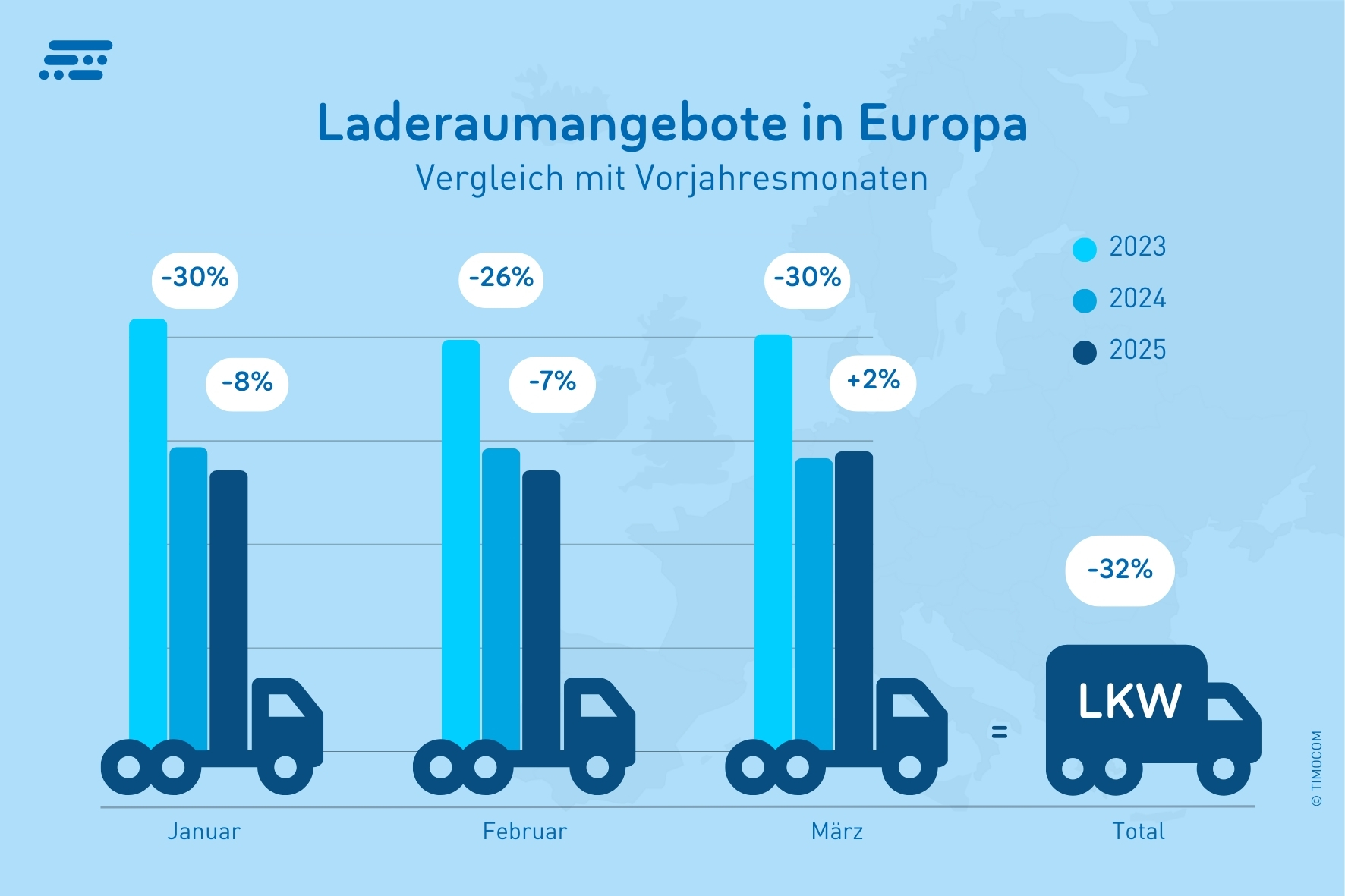 Im Vergleich zum Vorjahresquartal verzeichnete das Transportbarometer europaweit ein Plus von 30 % bei den Frachteingaben. Für den deutschen Markt ergab sich im ersten Quartal 2025 ein Zuwachs von 17 % (Januar +46 %, Februar +23 %, März –4 %). Die verstärkte Aktivität im Timocom-Spotmarkt zeigt: Viele Unternehmen decken ihren kurzfristigen Transportbedarf bevorzugt über flexible Marktplätze.