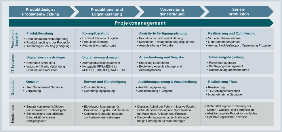 Projektansatz und Leistungsangebot: Das Spektrum reicht von der Produktionsplanung bis zur „Smart Factory“. Grafik: Protema