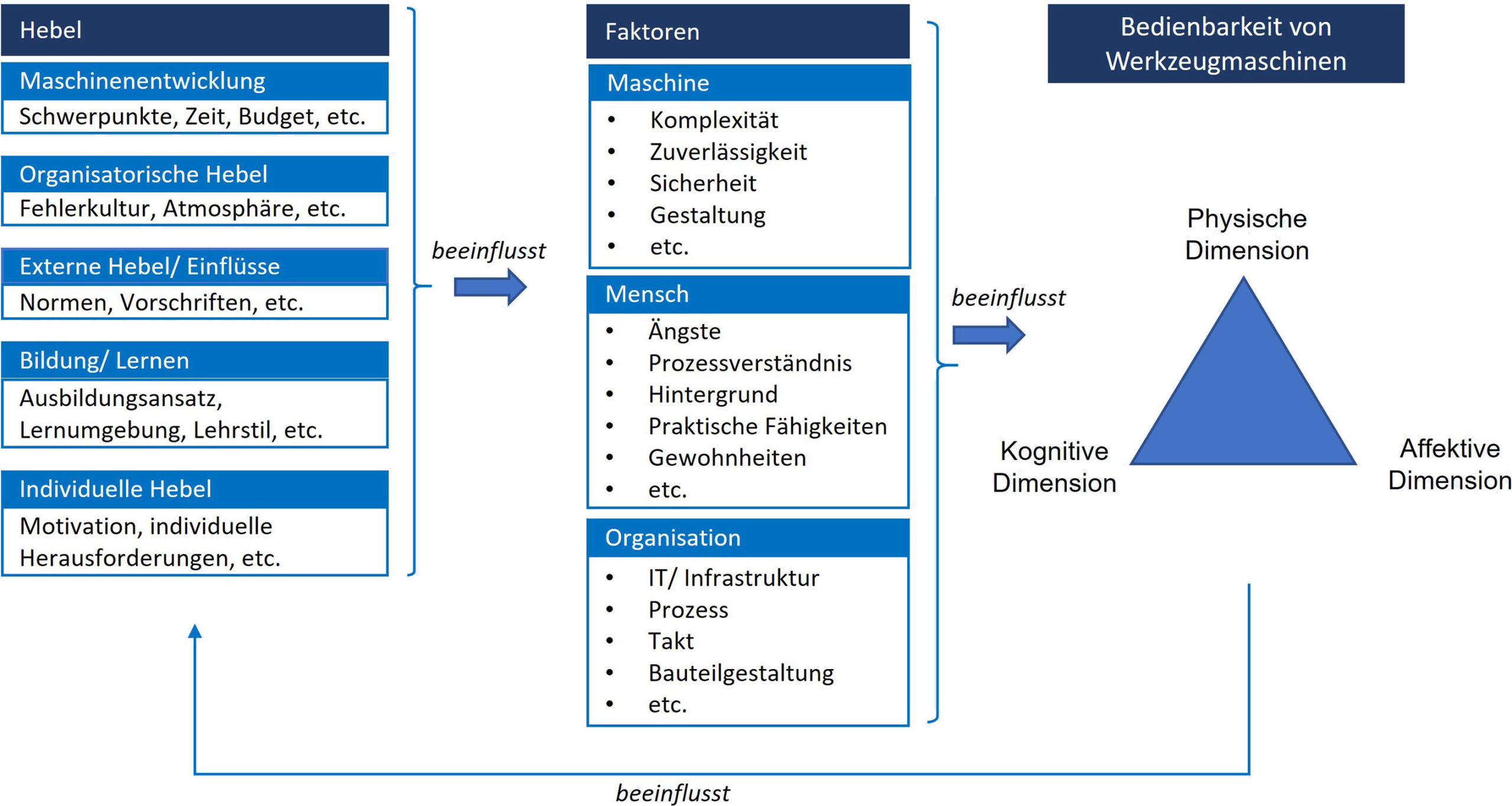 In einer qualitativen, explorativen Studie wurden Aspekte erfasst, welche die Bedienbarkeit von Werkzeugmaschinen beeinflussen. Hierzu wurden Interviews und Beobachtungen mit Entwicklern, Ausbildern und Bedienern von Werkzeugmaschinen durchgeführt. Die erarbeiteten Aspekte wurden anschließend systematisch analysiert, kategorisiert und in direkte und indirekte Einflüsse untergliedert. Hieraus wurde das hier vorgestellte Modell des Regelkreises der Bedienbarkeit von Werkzeugmaschinen abgeleitet. S. 344