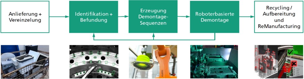 Das Projekt „iDear“ vom Fraunhofer-Institut für Fabrikbetrieb und -automatisierung IFF in Magdeburg bündelt die Kompetenzen des gesamten Instituts aus den Fachbereichen Robotersysteme, Fertigungsmesstechnik und digitale Assistenzsysteme, Energiesysteme und Infrastrukturen und Logistik- und Fabriksysteme und Geschäftsmodell- und Prozessinnovation mit dem Ziel, eine automatisierte, intelligente Demontage mit dem technologisch maximal möglichen Automatisierungsgrad zu realisieren. Dabei werden aller relevanten technologischen Teilsysteme in Zusammenhang mit dynamischen Geschäftsmodellen, Ökosystemen und Lieferketten betrachtet. Zentrale Anforderungen an die intelligente und effiziente automatisierte Demontage sind die Flexibilität und Adaptivität, um sich an unterschiedliche Produkte beziehungsweise Produktvarianten anzupassen und auf Unsicherheiten durch Verschleiß, Fehlteile sowie in Hinsicht der Verfügbarkeit von Produktdaten autonom reagieren zu können.