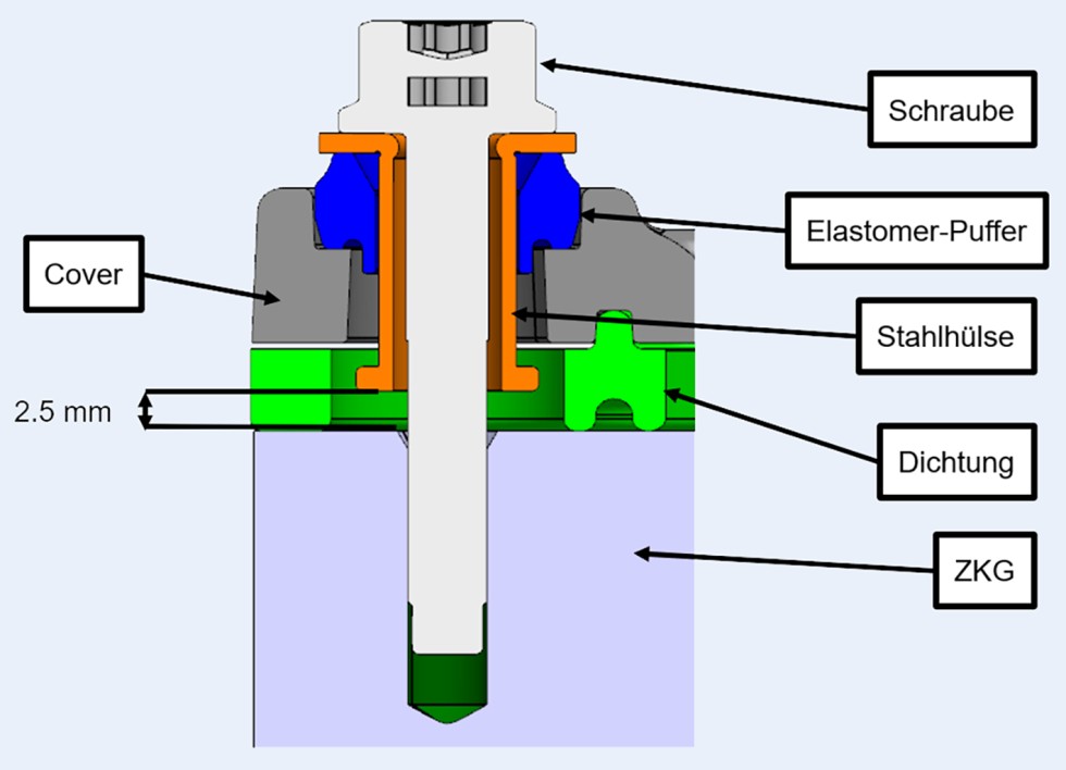 Zur schwingungstechnischen Entkopplung und Reduzierung von Schallemissionen ist das Kunststoffbauteil auf der heißen Krümmer-Seite entkoppelt. Um das Cover mit dem Zylindergehäuse zu verschrauben und dennoch zu entkoppeln, wurden Verbindungselemente vom Typ Honsel soundFIX M6 eingesetzt. In Bild 1 ist der Aufbau der Entkopplung im Schnitt an einer Verschraubung dargestellt. Beim Anziehen der Schraube wird das Gehäuse über den Elastomer-Puffer, bis zum Anschlag der Stahlhülse über die Dichtung an das Zylinderkurbelgehäuse (ZKG) gepresst.