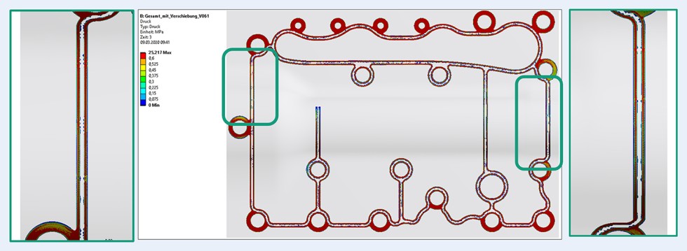 Die beiden kritischsten Stellen im Bereich der Krümmungen wurden vergrößert dargestellt. Im oberen Bereich des Covers ist die Verteilung des Kühlmittels erkennbar. Als Anforderungen für die Dichtung ergeben sich im Bereich des Kühlmittels 3 bar Innendruck und für die Abdichtung der restlichen Dichtung 1,3 bar Innendruck gegenüber dem Blow-By des Öl/Luft Gemisches. Die Pressung in der so gestalteten Kontaktfläche unterschreitet in keinem Punkt 0,6 MPa und erfüllt damit diese Bedingungen.