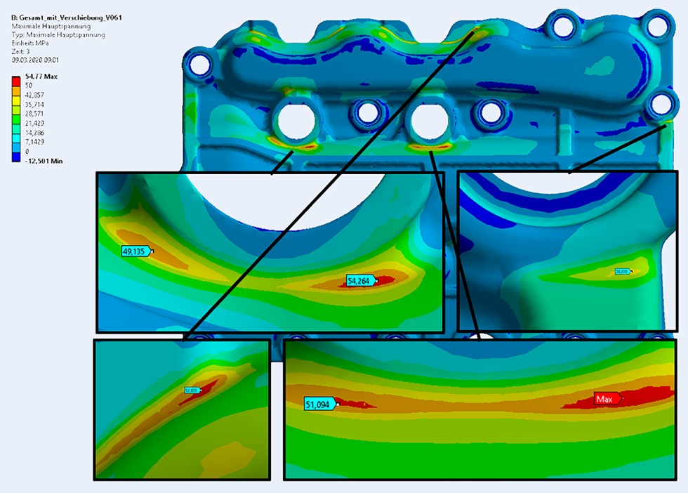Die entstehenden Spannungen im Cover wurden ebenfalls mittels einer FEM Simulation untersucht. Aufgrund der Materialeigenschaften der Kunststoffkomponente wurden Zug- und Druckspannungen getrennt voneinander betrachtet, da die zulässige Druckspannung bei 130 °C 240 MPa, die zulässige Zugspannung jedoch lediglich 110 MPa beträgt. Die höchsten Bauteilspannungen entstehen dabei beim schnellen Aufheizen, aufgrund der unterschiedlichen Wärmedehnungen und Bauteiltempe- raturen. In Bild 3 ist die Zugspannungsverteilung dargestellt. Besonders in den Bereichen der Krafteinleitungspunkte kommt es dabei auf der Oberseite des Bauteils zu maximalen Zugspannungen von 55 MPa. Da auch die Druckspannungen bei der gewählten Konstruktion deutlich unter den zulässigen Werten lagen, stand der Umsetzung nichts im Wege.
