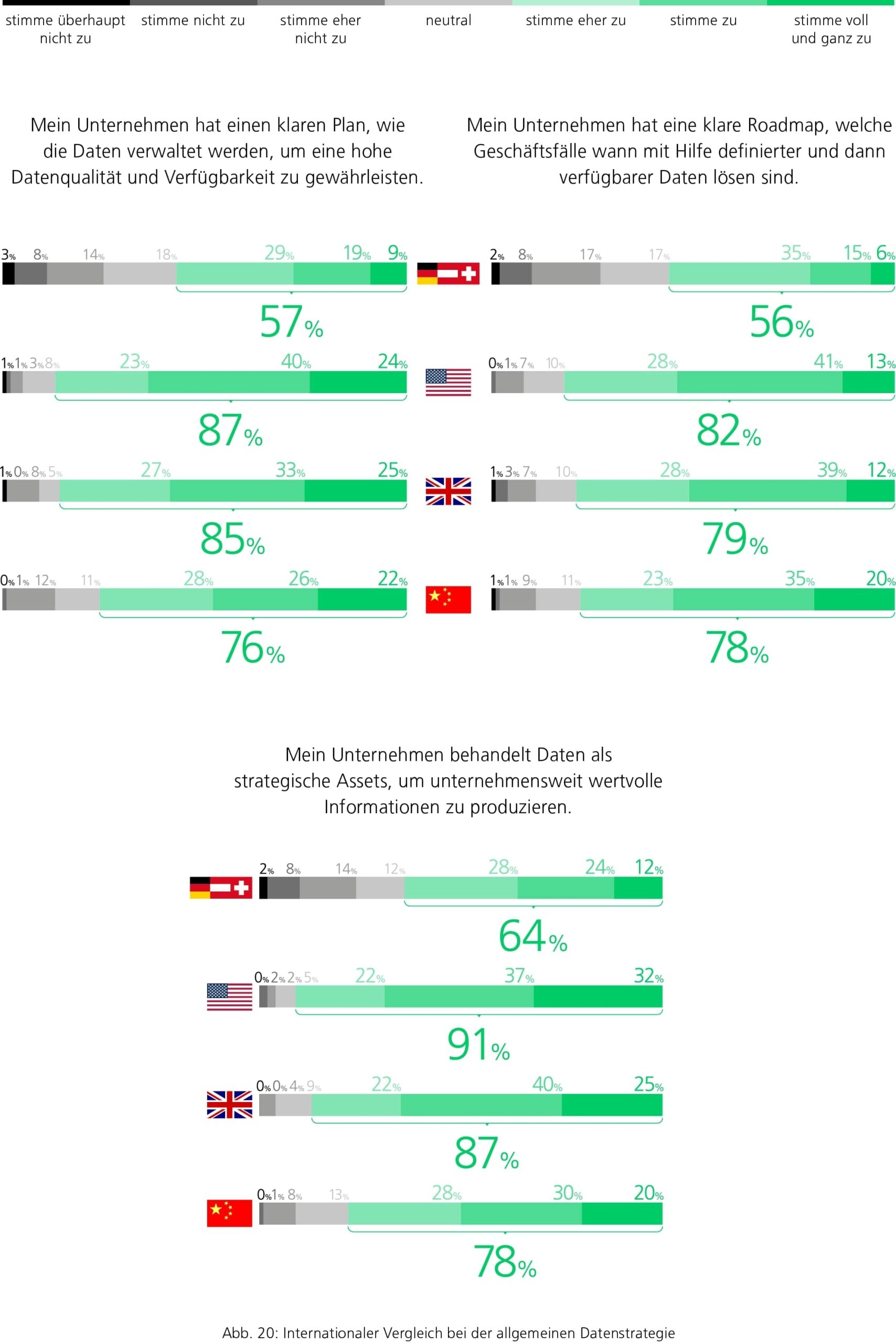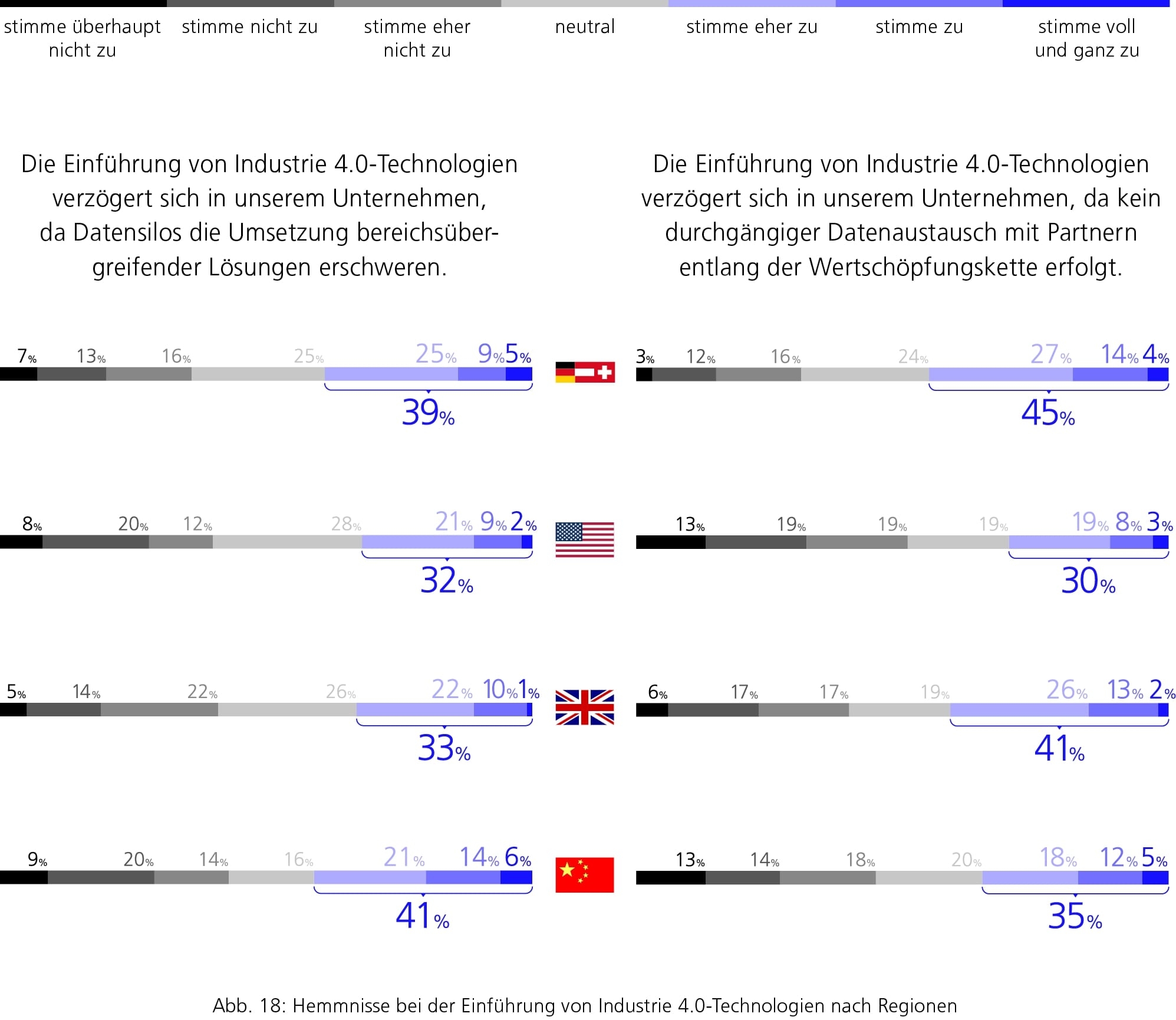 Gründe dafür ist beispielsweise das Fehlen von entsprechenden Datenstrategien sowie der effizienten Nutzung der eigenen Daten entlang der gesamten Wertschöpfungskette. Datensilos und der fehlende Austausch hemmen die Digitalisierung. Auch der Reifegrad der Datenanalysefähigkeit weist einen signifikanten Rückstand auf.