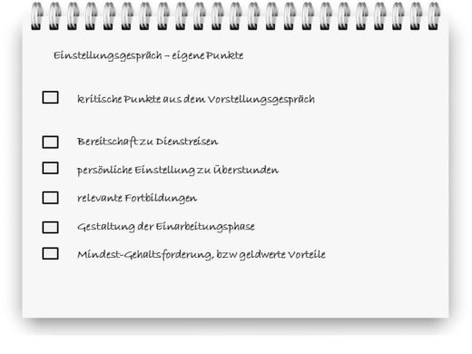 Im nächsten Schritt sollten Sie im Vorfeld des Einstellungsgesprächs alle Fragen auflisten, die Ihrer Ansicht nach vor einer Vertragsunterzeichnung unbedingt zur Sprache kommen müssen. Legen Sie dafür eine sorgfältig geschriebene Liste an, beispielsweise in der Notizen-Funktion Ihres Smartphones – zu jedem Zeitpunkt des Bewerbungsverfahrens macht es einen guten Eindruck, wenn Ihre umfassenden Vorbereitungen sichtbar werden. Das zeigt ihr ernsthaftes Interesse an der ausgeschriebenen Stelle. Diese Liste können Sie also auch während des Einstellungsgesprächs öffnen, wenn der künftige Arbeitgeber wissen möchte, ob es noch Fragen gibt. Natürlich ziehen Sie dann nicht einfach Ihr Handy aus der Tasche, sondern führen die Aktion souverän ein: „Einen kleinen Moment, bitte. Ich schaue kurz in meine Liste, ob ein Punkt fehlt.“