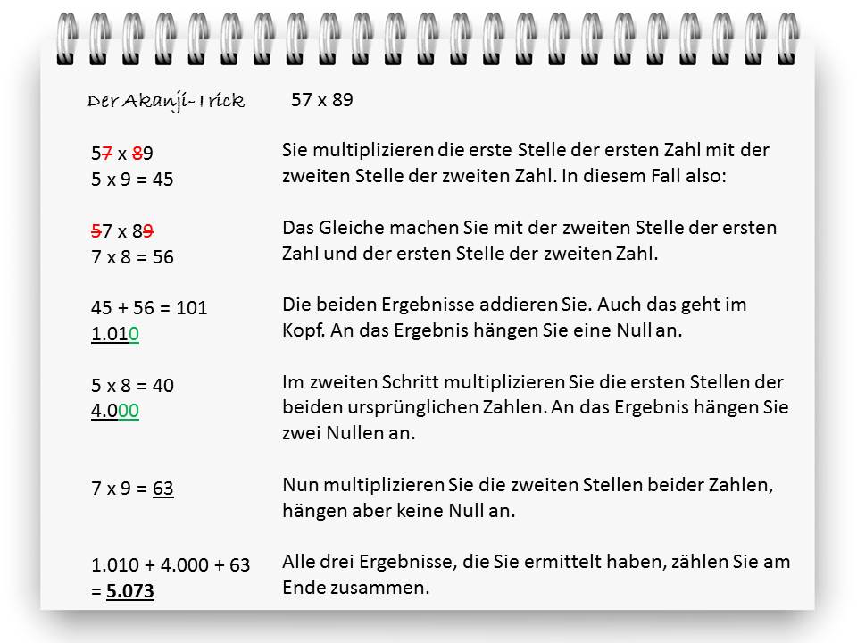 Vermutlich hat Akanji kreuzweise multipliziert. Mit etwas Übung können Sie auf diese Weise jede beliebige zweistellige Zahl mit einer anderen multiplizieren. Einen Zeitvorteil erreichen Sie wohlgemerkt nur, wenn Sie den Rechenweg so sehr verinnerlicht haben, dass Sie ihn automatisch durchführen. Das gelingt – wie schon erwähnt – nur durch ganz viel Übung. Einige Rechenbeispiel: