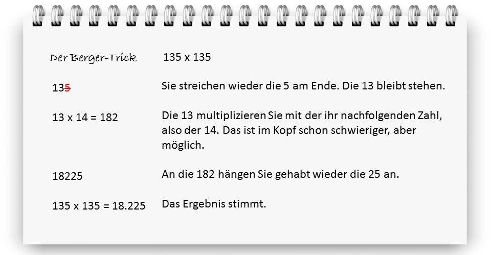 Das ist für Anfänger nicht zu machen. Berger empfiehlt, eine zweistellige Zahl, die eine 5 am Ende hat, mit sich selbst zu multiplizieren – zum Beispiel die 75. Das sei „etwas Kleines für den Anfang“, sagt er gegenüber ingenieur.de, dürfte einem ungeübten Rechner aber schon Schweißperlen auf die Stirn treiben. Berger nutzt dafür diesen Trick, der ursprünglich aus der Vedischen Mathematik kommt (dazu später noch mehr):