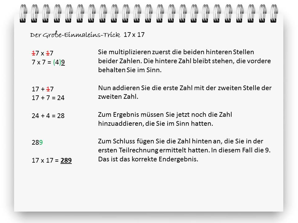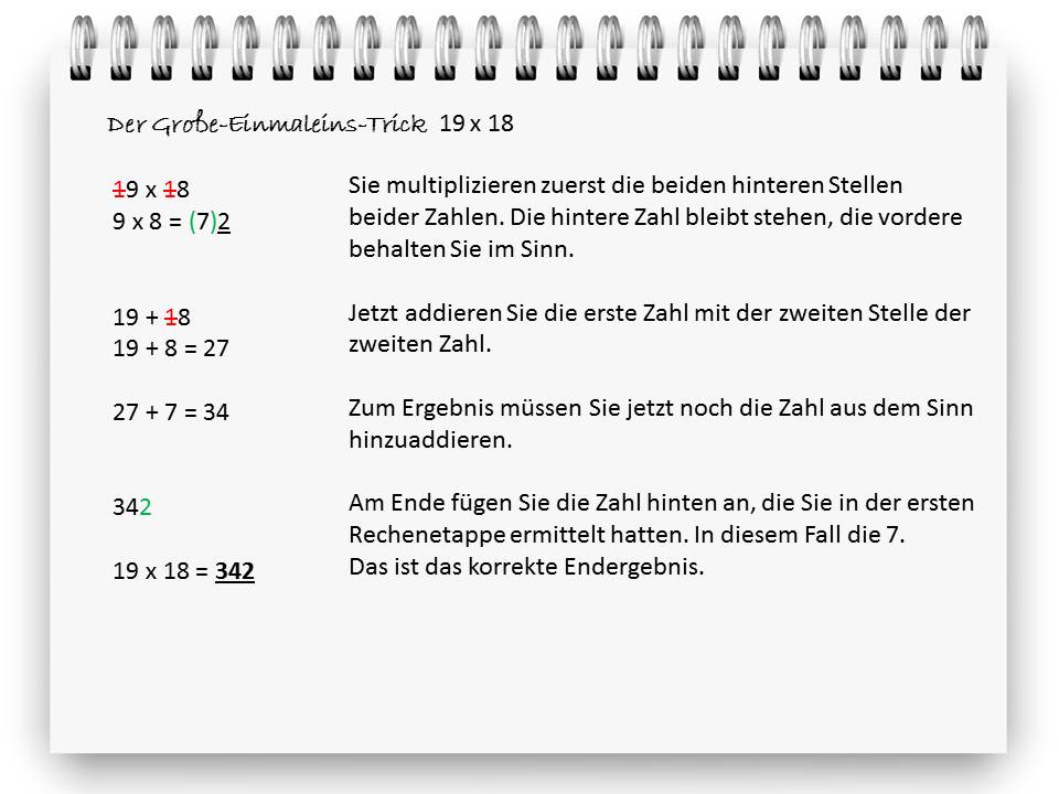 Das kleine Einmaleins (1 x 1 bis 9 x 9) sollte sitzen. Das große Einmaleins (10 x 10 bis 19 x 19) ist weniger geläufig. Mit diesem Trick sparen Sie sich das Auswendiglernen. Wie rechnet man zum Beispiel 17 x 17 oder 19 x 18? Am einfachsten geht es so: