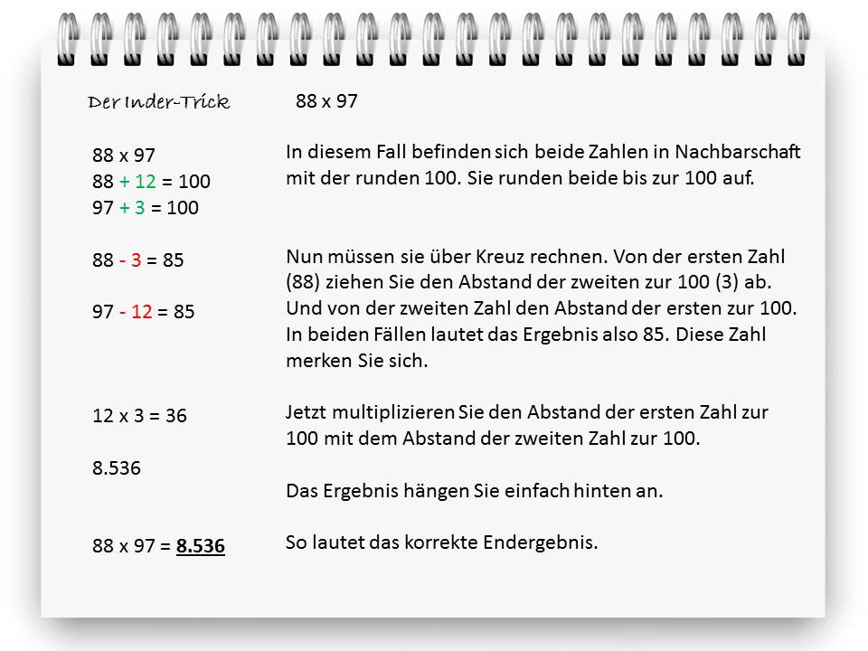 Die Inder haben im frühen 20. Jahrhundert die Vedische Mathematik hervorgebracht. Sie ähnelt der Trachtenberg-Methode, enthält aber noch zusätzliche Abkürzungen. Zum Beispiel können Sie sehr schnell subtrahieren, auch mit großen und ungeraden Zahlen. Und das Prinzip funktioninert auch beim Multiplizieren. Hier einige Beispiele: