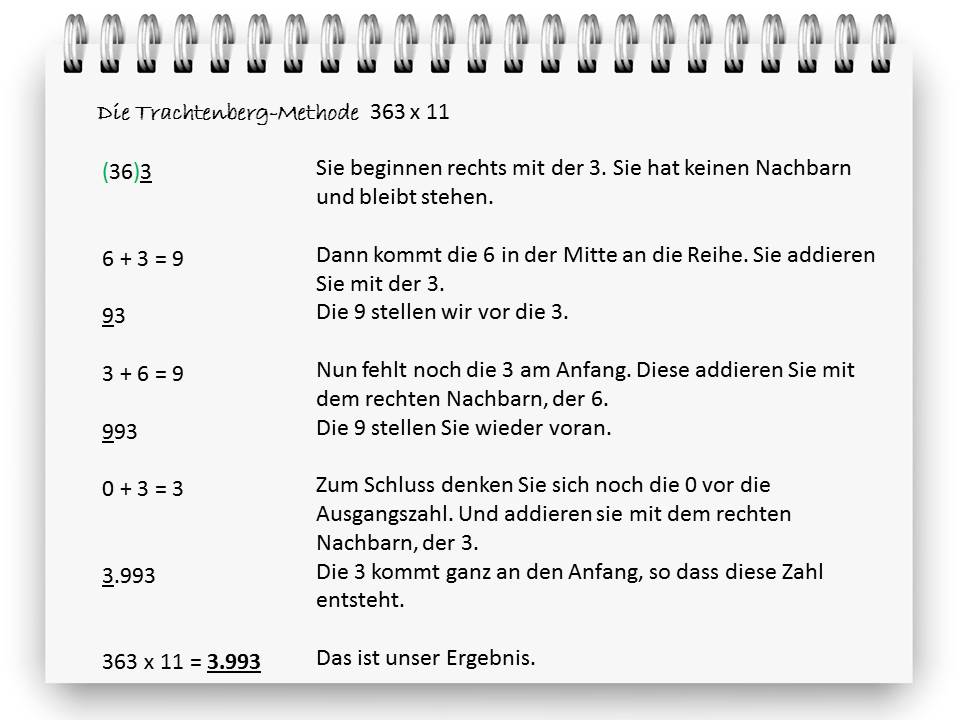 Mit der Trachtenberg-Methode geht es – etwas Training vorausgesetzt – einfacher. Dabei addieren Sie bei einstelligen Multiplikatoren jede Ziffer der ersten Zahl mit ihrem halben Nachbarn. Sie fangen rechts an. Auch für zweistellige Multiplikatoren hat Trachtenberg eigene Formeln entwickelt. Zum Beispiel für die 11. Dabei addieren Sie jede Ziffer der ersten Zahl einfach mit Ihrem Nachbarn. Zwei Rechenbeispiele: