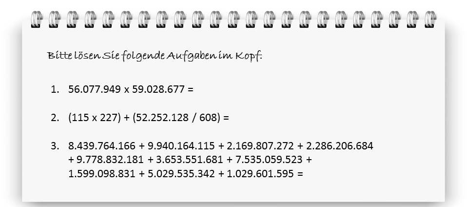 Auch Andreas Berger ist ein Ass im Kopfrechnen. Bei der letzten Weltmeisterschaft in Wolfsburg belegte der Thüringer Platz 17. Dabei mussten die Teilnehmer unter anderem diese drei Aufgaben lösen – so schnell wie möglich und ohne Hilfsmittel: