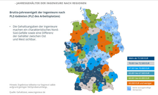 Die Gehaltsangaben der Ingenieure zeigen ein typisches Nord-Süd-Gefälle sowie Unterschiede zwischen den Gehältern im Osten und Westen des Landes.