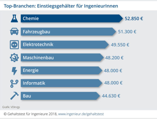 Ingenieure im Maschinen- und Anlagenbau — dabei handelt es sich zumeist, aber nicht ausschließlich um Personen mit einem Maschinenbaustudium — mit weniger als zwei Jahren Berufserfahrung können laut VDI-Gehaltsreport mit einem jährlichen Durchschnittseinkommen von zirka 51.000 Euro brutto rechnen. Damit liegen Berufseinsteiger erstmals über der Marke von 50.000 Euro, aber unter dem Durchschnittswert aller Branchen von 52.450 Euro. Zum Vergleich: Ingenieure in der Pharma- und Chemieindustrie steigen mit durchschnittlich 61.170 Euro brutto ein, am unteren Ende des Spektrums befinden sich Bauingenieure mit rund 47.700 Euro brutto.