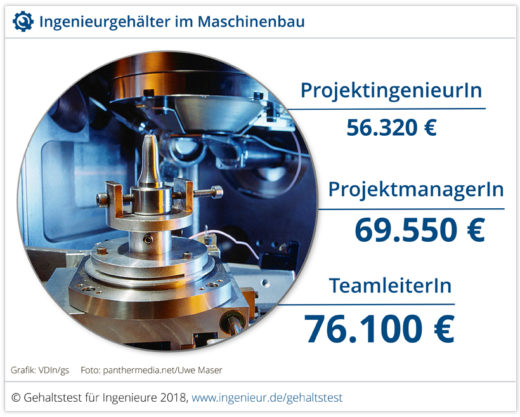 Ingenieure mit mindestens zwei Jahren Berufserfahrung im Maschinen- und Anlagenbau verdienen laut VDI-Gehaltsreport im Schnitt rund 71.500 Euro brutto im Jahr. Der Durchschnittswert für alle Ingenieure liegt mit zirka 72.600 aber noch geringfügig höher. Am besten verdienen erfahrene Ingenieure in der Pharma- und chemischen Industrie mit 87.600 Euro und im Fahrzeugbau mit rund 79.400 Euro, am wenigsten im Baugewerbe (62.350 Euro) und in Ingenieur- und Planungsbüros (ca. 59.000 Euro).