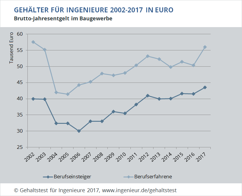 Mit der Berufserfahrung wächst auch das Gehalt stetig. Während Sie in den ersten Jahren eher kleinere Gehaltssprünge verzeichnen, knacken Sie wahrscheinlich nach 6-10 Jahren Berufserfahrung die 60.000 Euro-Marke. Die höchsten Gehälter winken mit einer Leitungsfunktion, zum Beispiel als Teamleiter oder im Objektmanagement. Die Höhe des Gehalts richtet sich oft nach dem Verhandlungsgeschickt aus, sofern es keine Tarif-Bezahlung gibt. Notieren Sie für das Jahresgespräch, welche Erfolge Sie dem Unternehmen eingebracht haben. Vielleicht konnten Sie die Kosten stark senken aufgrund eines neuen Baustoffes.