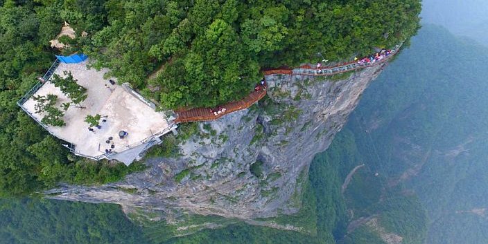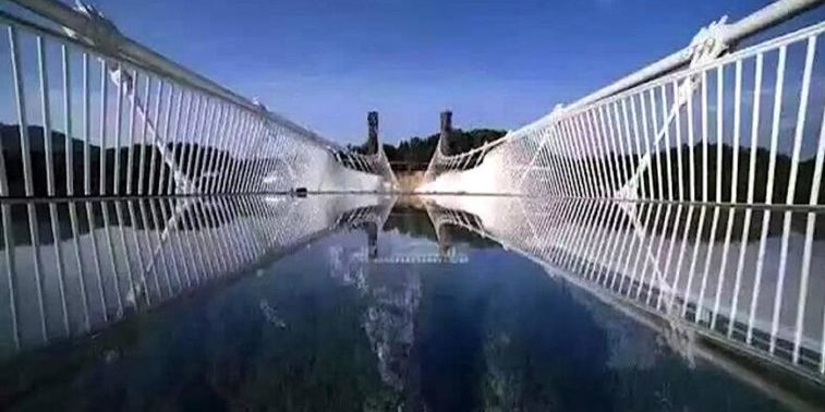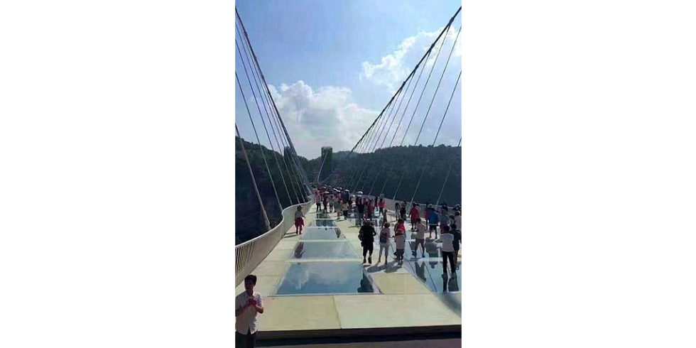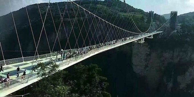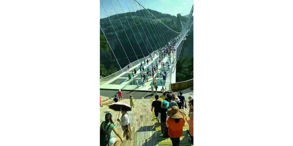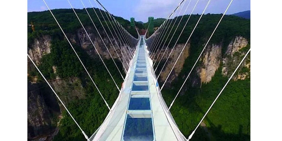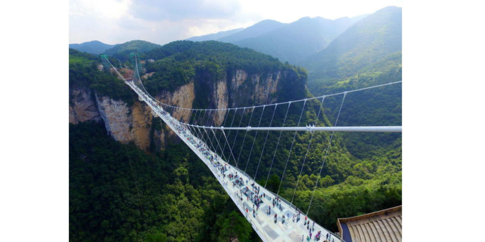 Die Zhangjiajie Grand Canyon Glass Bridge führt in bis zu 300 m Höhe über einen schroffen Canyon in den Zhangjiajie-Bergen im gleichnamigen Nationalpark. Der gläserne Weg ist 430 m lang und besteht aus exakt 99 sechs Meter breiten Bodenplatten aus dreischichtigem Glas.