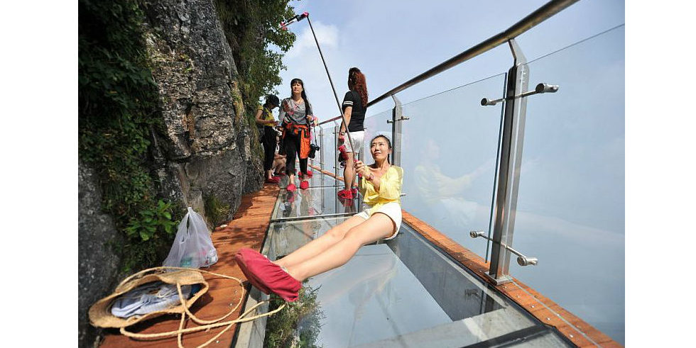 Und die müssen Verhaltensregeln einhalten, wenn sie die Brücke betreten: So dürfen die Besucher nicht mit Stöckelschuhen über die Glasscheiben laufen. Sie dürfen keine Kameras und Selfie-Sticks mitnehmen, weil herunterfallende spitze Gegenstände das Glas zerkratzen könnten.