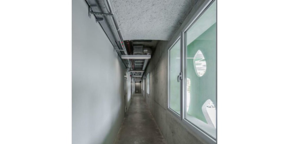 Und wie sieht das Gebäude innen aus? Funktional und streng: Rohe Sichtbetonflächen und unverkleidete Installationen unterstreichen den wissenschaftlichen Charakter.