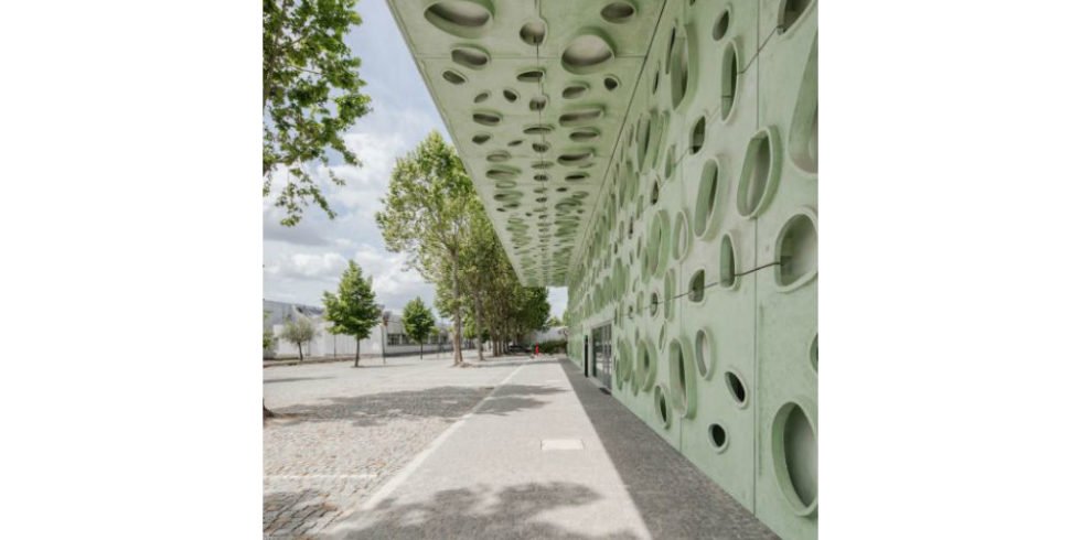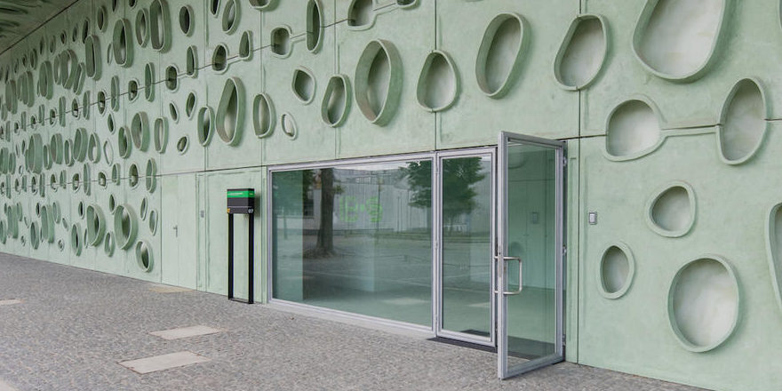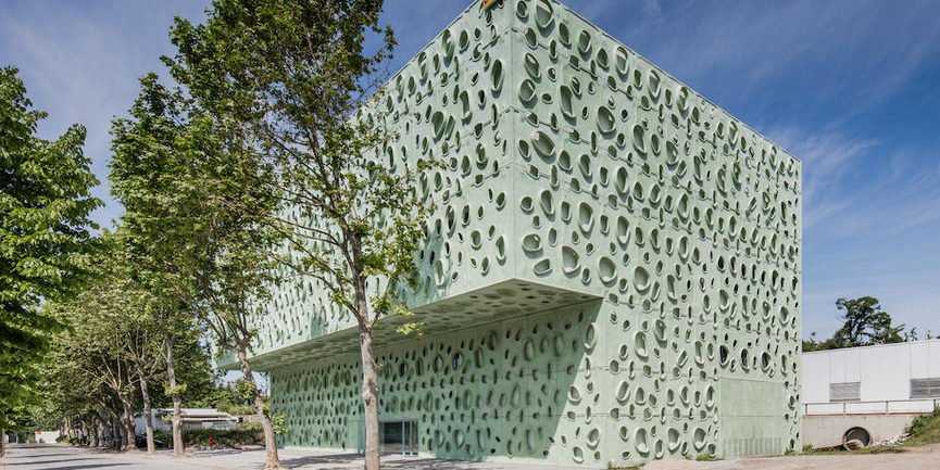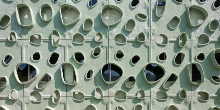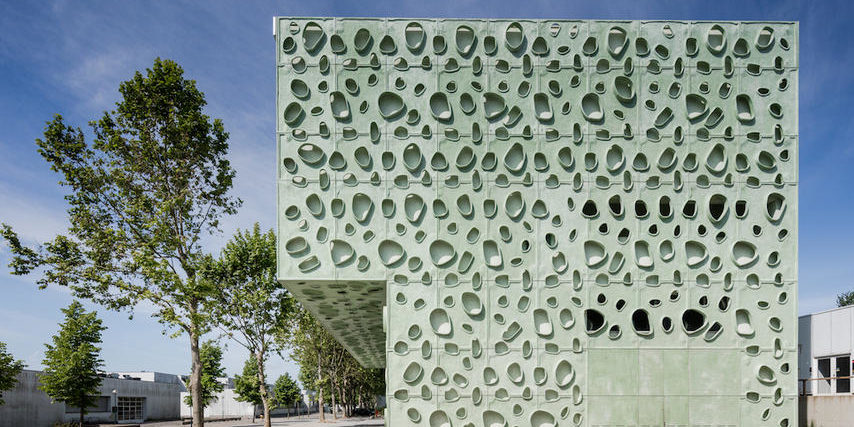 Was hat sich der Architekt denn bei dieser Fassade gedacht? Sie ist nicht nur auffällig mintgrün inmitten grauer Bauwerke. Ihre löchrige Struktur erinnert auch entfernt an Schweizer Käse. Falsch assoziiert: Denn die Fassade sieht aus wie Titan unter dem Mikroskop.