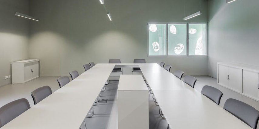 Farbe bringt hier lediglich das von außen bekannte Mintgrün ins Spiel. Und das ist so gewollt. Denn für den Rest sorgen die Öffnungen in der Gebäudehülle: Das einfallende Licht ist es, das die Räume gestaltet. Dabei ist die Form des dreigeschossigen Instituts schlicht rechteckig – 45 m lang und 20 m breit.