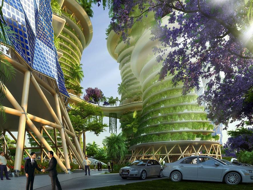 Und in Neu-Delhi will das Pariser Architekturbüro Vincent Callebaut sechs Hochhaustürme bauen lassen, die aussehen wie gestapelte grüne Dörfer. Verbaut werden soll überwiegend regional erzeugtes Holz.
