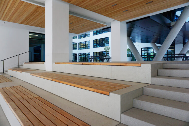 Zum Campus hin öffnet sich das Gebäude mit einer überdachten Sitztreppe – ein Ort für Austausch und informelle Begegnung. Zwei begrünte Innenhöfe sorgen für Licht und Aufenthaltsqualität im Inneren. Auf dem Dach schaffen Terrassen mit Blick über München bis hin zu den Alpen zusätzliche Aufenthaltsräume.