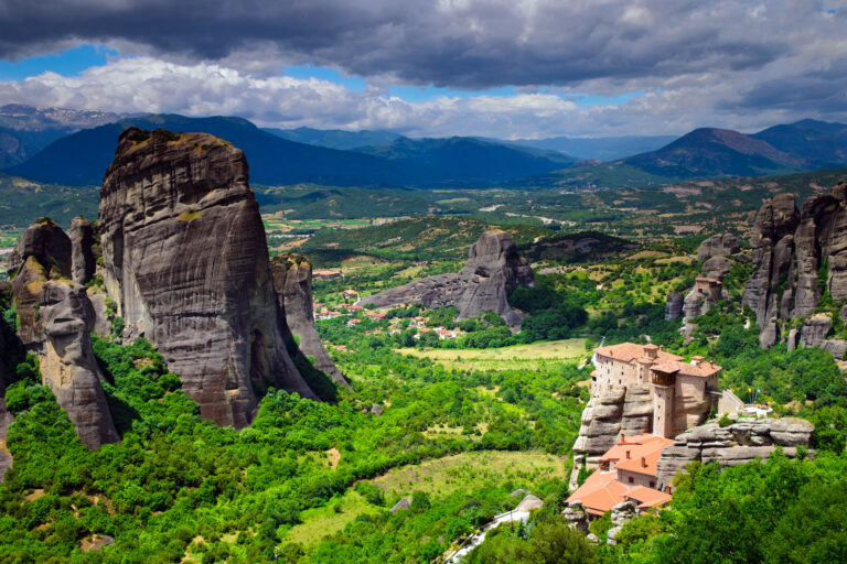 In der thessalischen Ebene, umgeben von der zerklüfteten Landschaft des Pindos-Gebirges, ragen steile Sandsteinfelsen wie riesige Nadeln in den Himmel. Auf ihren Spitzen thronen Klöster, scheinbar schwerelos über dem Tal – Meteora bedeutet wörtlich „in die Höhe gehoben“. Einst waren es 24, heute sind noch sechs bewohnt und zugänglich. Die Frage, die sich viele stellen: Wie gelangten Menschen und Baumaterialien auf diese glatten, teils 500 Meter hohen Felsen?