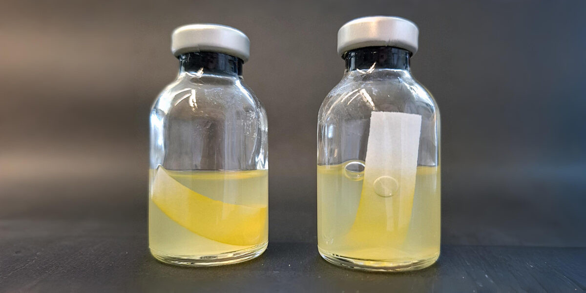 Der Vergleich zweier Kulturen von Clostridium thermocellum mit Filterpapier als Zellulosequelle zeigt den Einfluss des Pigments YAS auf den Zelluloseabbau durch das Bakterium. Während das linke Papier im Serum vollständig abgebaut ist, bleibt ein Teil des rechten Papiers ohne Kontakt mit YAS weitgehend intakt.