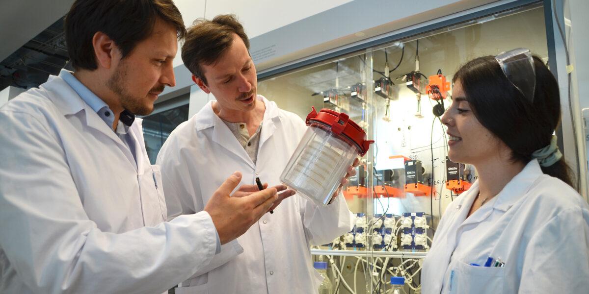 Stefan Pflügl (links) im Labor mit den Erstautor_innen der beiden Publikationen, Rémi Hocq (Mitte) und Angeliki Sitara (rechts). Die Forschenden machen Kohlenmonoxid für Bioreaktoren nutzbar – dank genetischem Umbau.