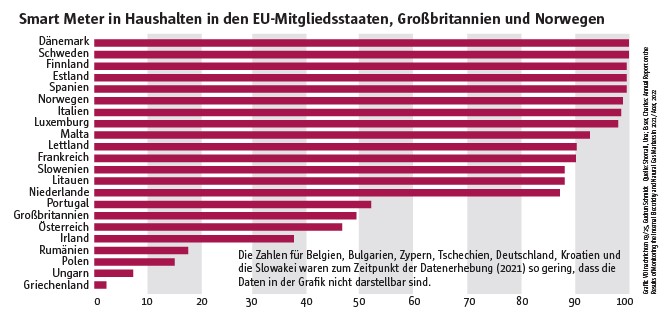 Zudem ist Deutschland bei der Stromversorgung teilweise ein digitales Entwicklungsland (s. Grafik). Deutschland hinkt beim Smart-Meter-Roll-out hinterher. China hat fast 100 % aller Haushalte mit intelligenten Zählern versorgt. Die Einführung begann früh und wurde durch staatliche Vorgaben und massive Investitionen der beiden großen Netzbetreiber vorangetrieben. Auch Länder wie Schweden, Dänemark und Italien haben fast alle Haushalte umgerüstet. In Estland, Spanien, Finnland, Luxemburg und Norwegen liegt die Durchdringung bei mindestens 98 %, viele andere EU-Staaten sind bei weit über 80 %.