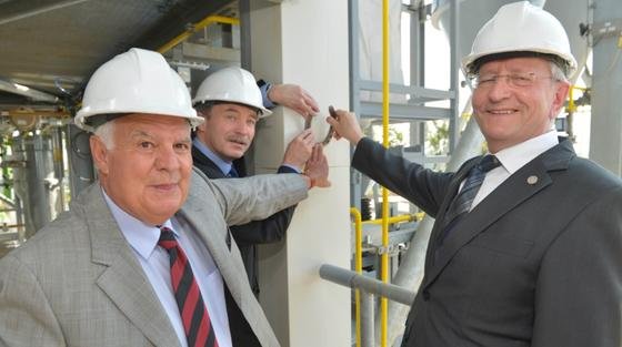 Bringen ein Hufeisen an der Versuchsanlage an (v. l.): Envirotherm-Geschäftsführer Dr. Georg Daradimos, Sachsens Staatsminister Sven Morlok und Professor Dr. Bernd Meyer, Direktor des Instituts für Energieverfahrenstechnik und Chemieingenieurwesen (IEC).
